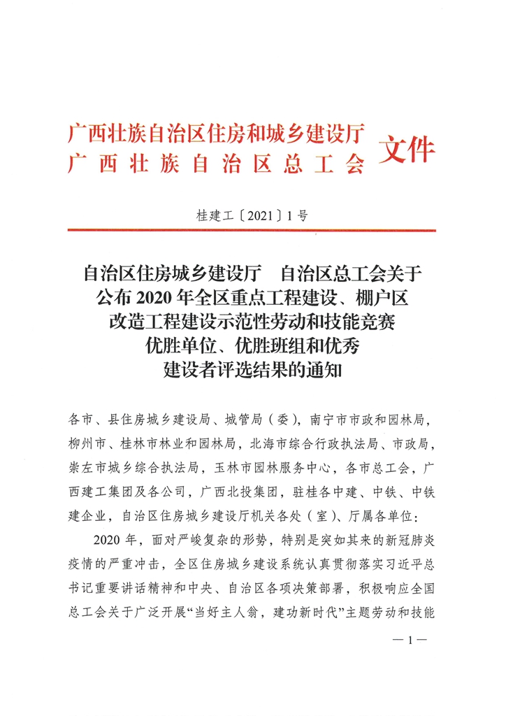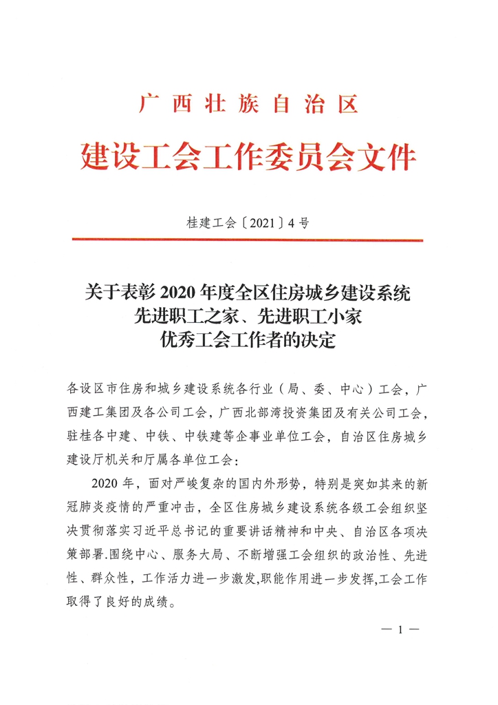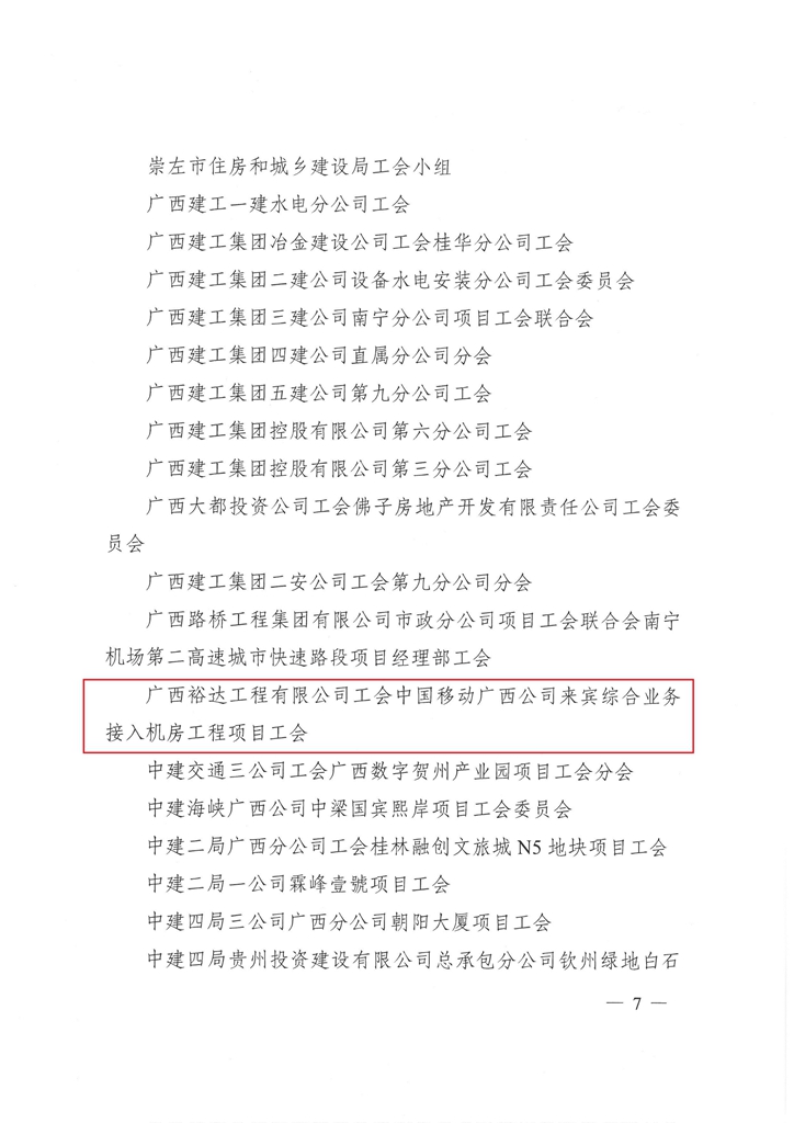 近日,從自治區(qū)住建廳及自治區(qū)總工會獲悉,工程公司自營項目—中國移動廣西來賓綜合業(yè)務接入機房工程(簡稱“移動項目”)再獲表彰,榮獲“2020年度全區(qū)重點工程建設示范性勞動和技能競賽優(yōu)勝班組”和“2020年度全區(qū)住房城鄉(xiāng)建設系統(tǒng)先進職工小家”榮譽稱號。